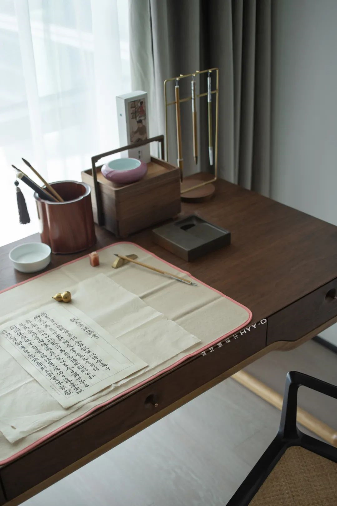 与客厅一家人互动的热闹氛围不同的是,书房拥有着静谧安然的力量,也是Z小姐的一处心灵之所,容纳了山川湖海和烟火日常。清空一天的嘈杂,提笔写字,给身体和心灵一段放空的享受,也是通过以身作则的方式,传递给正值青春期的孩子安静的力量。家就是一个能量汇聚的场域,不管何时,关乎幸福的想象大抵都如这般触手可及。