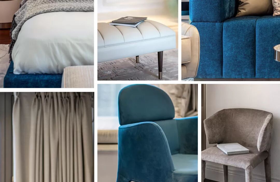 家具家私等采用拉扣工艺,例如客厅沙发、条凳、餐椅、主卧床具等,增加了细节性,同时也丰富了空间的层次感。