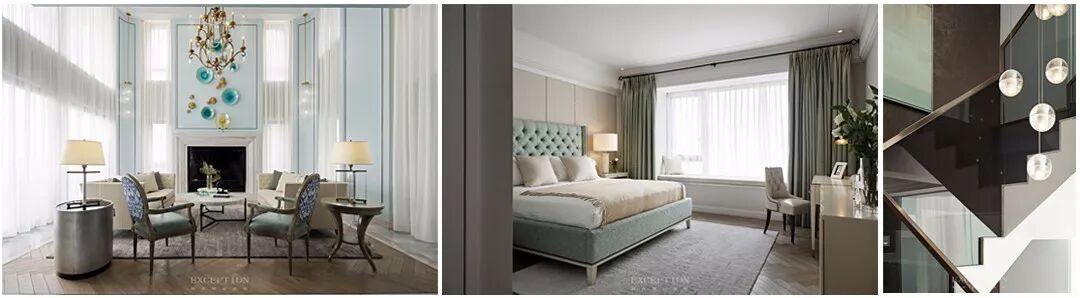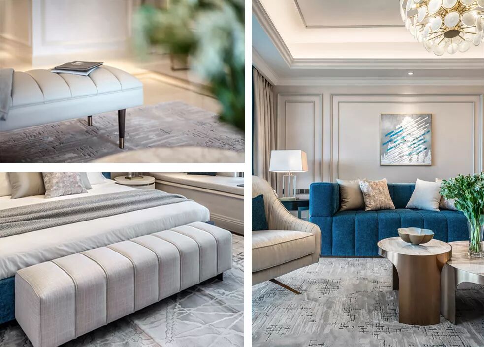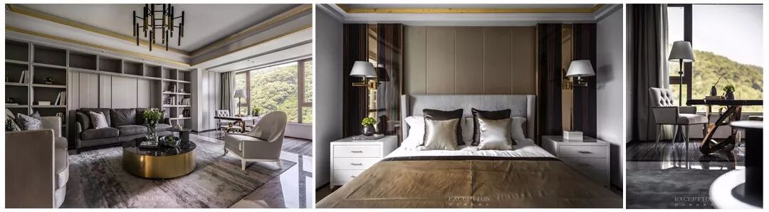 家私上选取绒布、皮革、布艺等面料,细腻亲肤,凸显之感。家具上融入金属元素,增加时尚、精致的感觉。