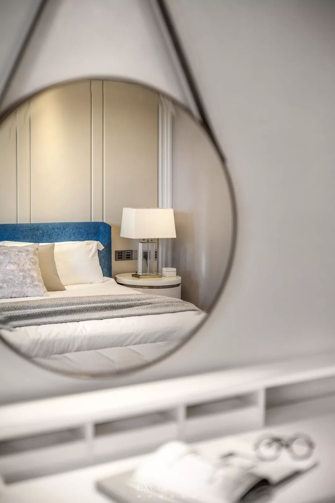 谧静舒适的蓝延续到主卧,与一袭素色床品不期而遇,不喧哗却独具格调,恰如艺术与生活的完美邂逅。设计将生活的质感美学毫无保留地呈敬,贝壳白边柜闪耀星星点点的光晕,诉说着惬意舒朗的生活情状,个性圆镜映照出伊人纯真的模样,窗外城景入画,丰盛室内精彩生活。