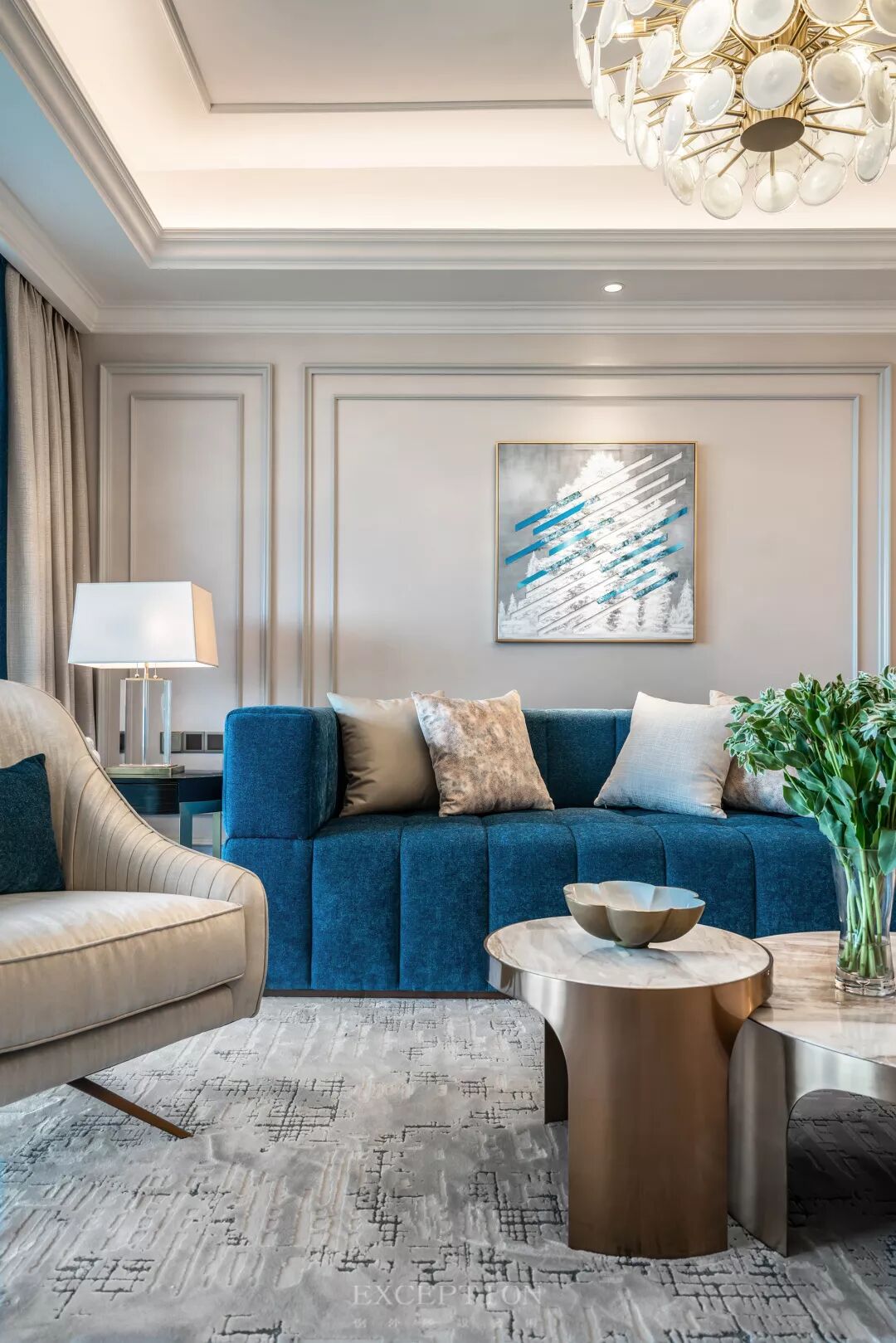 配色:米白色、浅咖色、蓝色、白色、金属色。宝蓝对于空间尊贵感的营造功不可没,纯净的白色、品质感的金属色,让空间充满低调奢华的美感。