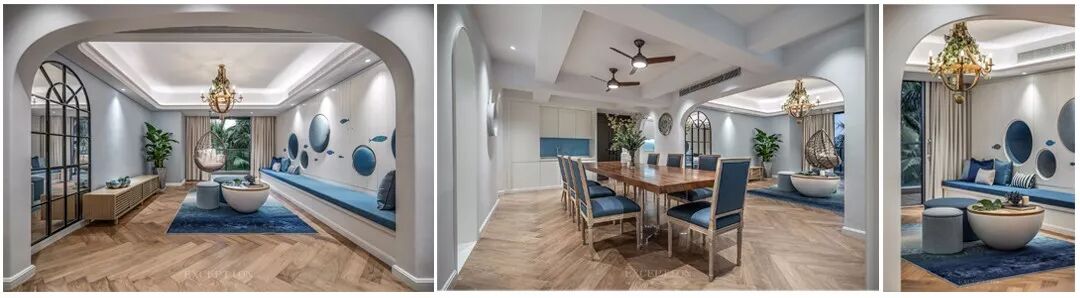 不同空间虽然功能不同,但却通过软装彼此呼应,增加了空间的互动性。例如:客厅蓝色沙发与主卧蓝色单椅相搭配,客厅墙上蓝白相间的挂画与主卧床品配色不谋而合。玄关装饰镜与客厅装饰镜无声契合,从视觉上延伸了空间。