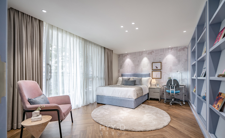 女儿房采取无主灯设计,书桌的高度与台灯设计都参考小孩的身高与学习习惯,做到更加地人性化。两间儿童房都定制了一整面的展示型斜面书架,方便小朋友们取放书籍。
