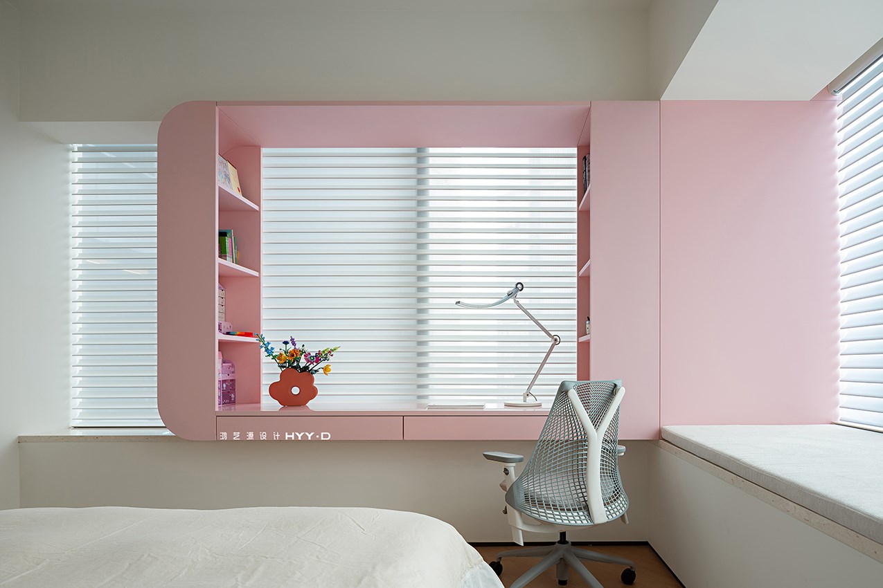 将飘窗空间作为孩子学习看书的小天地,让有限的空间被利用到极致。随处可见的收纳设计让空间整洁有序,粉白的配色柔化了生活的棱角,让女孩的成长满目阳光和诗意。